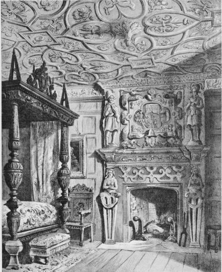 which was applied to the first-named building for obvious reasons. In those Elizabethan days there was a growing desire to dissipate gloom {24} and to reverse the old practice of building mainly for strength. If Bess of Hardwick exaggerated the advantage of window space at Hardwick Hall and gave it somewhat the appearance of a modern steel-framed structure, she provided us with compensations in the same house, for the state apartment, a corner of which is shown in the illustration by Lake Price (Plate XXV), possesses great beauty in conception. It is 65 feet long, about 30 feet wide, and 26 feet high. The state bed included in the drawing came from Chatsworth.