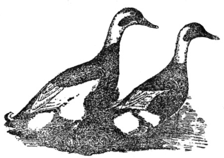 Gl'inglesi, noti abilissimi modificatori di caratteri degli animali domestici in genere, trasformatori, [13] miglioratori, sacrificando talvolta fin troppo alla mania, a detrimento di qualità intrinsiche, hanno voluto perfezionare anche l'anatra di Rouen, non tanto dal lato della livrea per la quale ottennero maggior regolarità, quanto da quello del volume che hanno reso anche più forte. È un lavoro che merita considerazione ma che non ha valore se non è seguito con la più rigorosa selezione continua, altrimenti il frutto va perduto; e poi resta a sapersi se animali così diligentemente selezionati conservino la rusticità del tipo originale. Il manto scuro del tipo inglese si ebbe probabilmente dall'incrocio del Rouen francese chiaro con quella prossima parente che è la Duclair pure normanna, ma dal piumame scurissimo; il volume poi è dovuto oltre che alla selezione, ad una alimentazione speciale ed a qualche altra misura, formante il segreto di quegli strenui allevatori.