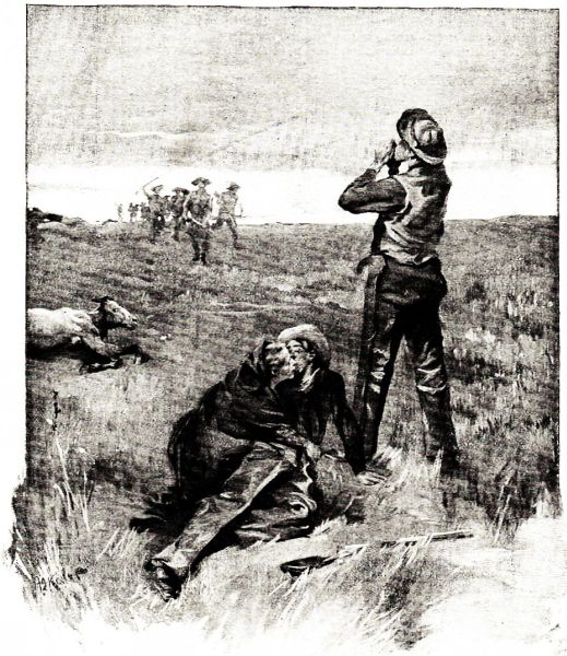 A small herd of cattle roving about the prairie, moved by the curiosity inherent in animals, had drawn near, and excited by the smell of blood, were pawing the earth, bellowing with rage, and circling ever closer and closer about the helpless lad. He could see their wide horns glistening in the moonlight. "Mother! Father!" he breathed; and dropping his head back upon the cold turf, he closed his eyes in instant expectation of death.