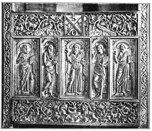 In every museum there are examples of the Byzantino-German school, one branch of which was situated in the Rhine Provinces. The relief of the Rhenish carvings is usually bold, and the figures large and long, but they often lack both the spontaneity of the Germans and the elegance of the Byzantines. A charming representation of the Nativity encircled by an embattled wall, and another plaque with the Visitation of the Magi, in the Victoria and Albert Museum, show these features, the figures having almost the appearance of children’s toys set out at random without the slightest relation to the background. A peculiar feature in some of these carvings, is the row of dots drilled down the centre of each fold. There was also a school of direct copiers of Byzantine carvings, which varies from the most miserable caricatures to such splendidly finished work, that critics experience great difficulty in deciding for or against the Byzantine origin. A case in point is the magnificent book cover in the Vatican, which came from the Abbey of Lorsch in Germany, and the similar panel in the Victoria and Albert Museum.
