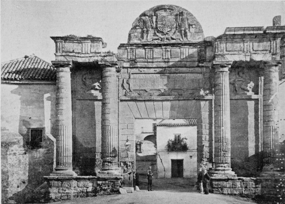 Framed in the arch of a city gateway, he will see a lovely vista of vineyard, olive-crowned hillock, and meditative, grey sierra, rising to the blue.