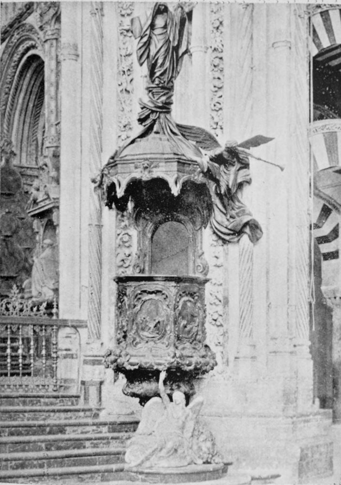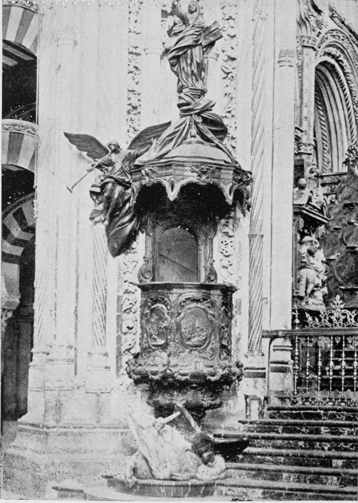 [5] The four columns are yet in place in what is now the chapel of St. Peter. Behind the mih-rab at Cordova was a room where other copies of the Koran were kept. Both the sanctuary, and the mih-rab room, now form part of St. Peter’s Chapel, which the inhabitants vulgarly call La Capilla del Zancarron—the chapel of the shin-bone—from a popular belief that the shin-bone of the Prophet was there preserved.