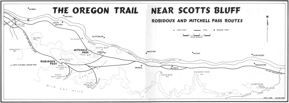 At the crest of Mitchell Pass, State Route 86 continues westward through Mitchell Valley to the Wyoming State line. From the pass, the trough of the Oregon Trail makes an abrupt hairpin turn to get around the head of a ravine, then veers northwestward toward the North Platte River, and the old crossing at the mouth of Horse Creek, near present Lyman, Nebr. In Mitchell Pass and a few hundred yards west thereof, the Oregon Trail trough is exceptionally well-defined despite the passage of nearly 100 years since it was heavily traveled. The unusual depth of the old trail through this area results from the fact that the countless thousands of animals and wagons had to go single file through the Mitchell Pass bottleneck. There is a trail from the Mitchell Pass parking area to the William H. Jackson campsite marker.