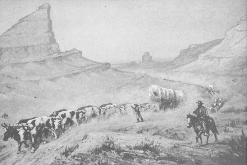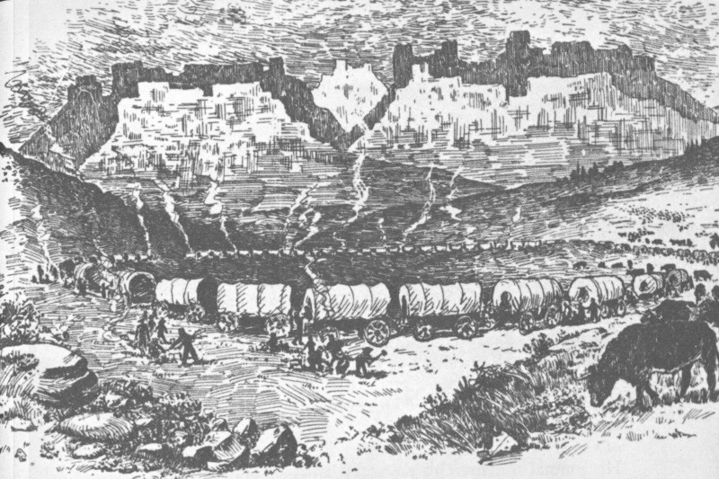 In 1843 Scotts Bluff witnessed the first mass migration to Oregon; it was promoted by Marcus Whitman. In May more than 1,000 persons, including 130 women and 610 children, left Independence, Mo., for the long trek overland. This well-organized expedition, with military rules to ensure protection, an elected captain, and division into companies, set the pattern for the hundreds of emigrant trains to follow. The elected captain was Peter Burnett who was to become the first Governor of California in 1850. The “Cow Column,” the last and slowest of the 1843 companies, has achieved fame through the writings of Jesse Applegate. Overton Johnson relates that the train reached camp “by a fine Spring, at the foot of Scott’s Bluffs” on July 9.
