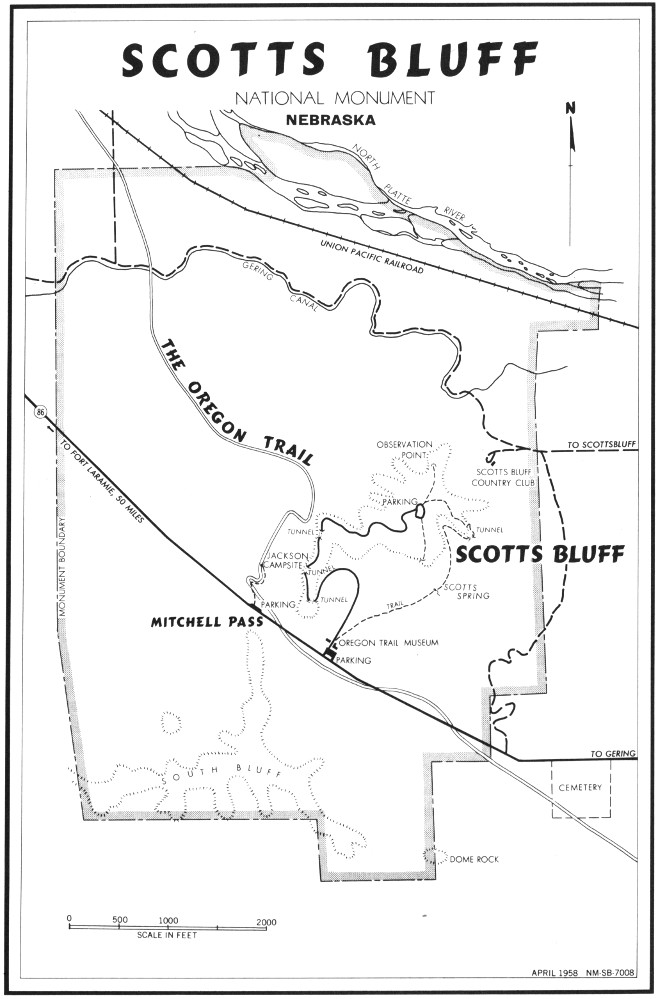 SCOTTS BLUFF was a celebrated landmark on the great North Platte Valley trunkline of “the Oregon Trail,” the traditional route of overland migration to Oregon, California, and Utah. Today the massive castellated bluff looks down upon concrete highways, railways, airports, irrigated farms, and bustling communities of the mid-20th century; but it is the same awe-inspiring sentinel which 100 years ago watched the passage of countless trains of ox-drawn covered wagons, and the twinkling of many campfires. Scotts Bluff National Monument keeps alive the epic story of our ancestors who dared cross the wilderness of plains and mountains to plant the western stars in the American flag.