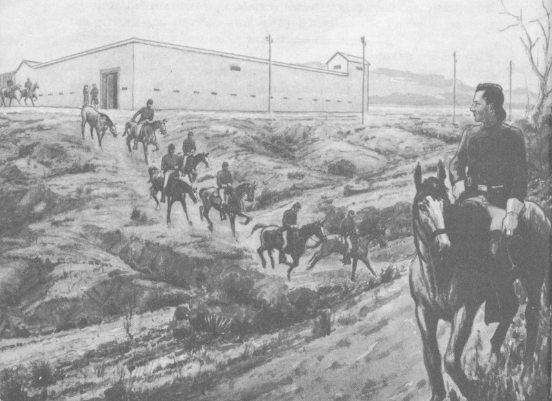 Cavalrymen leaving Fort Mitchell. Original sketch in Oregon Trail Museum.