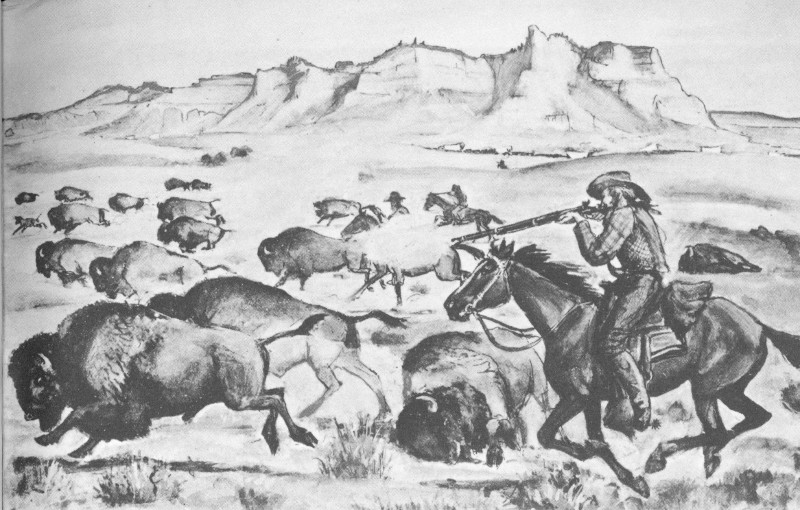 Hunting buffalo at Scotts Bluff. Original sketch in Oregon Trail Museum.