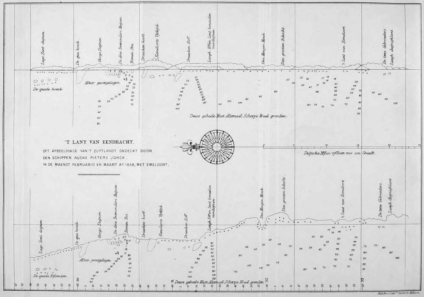 23. From another extract from these MS. logbooks at the Hague, which was made at the editor’s request, there was an additional observation of importance which is here omitted. Three times Captain Jonck speaks of a southern current running along the coast, which struck his attention in these seas. Among other passages he speaks of it in these terms: “We had deviated from our course fifteen minutes to the south, and this we attributed to a southern current, which we have observed several times on this coast, which is a strange thing, the being drawn by the current in spite of the wind and the waves.” Elsewhere he estimates the force of this current at ten miles in the twenty-four hours.