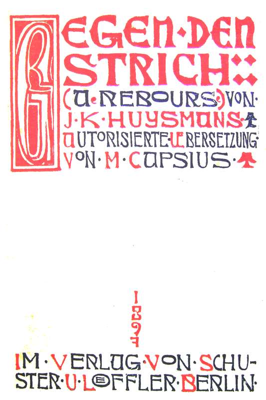 Und endlich noch befand sich auf dem Kamine, dessen Bekleidung ebenfalls aus einem prachtvollen florentinischen Messgewand hergestellt war, zwischen zwei Monstranzen aus vergoldetem Kupfer byzantischen Stils, welche der alten Abtei Bois-de-Bievre entnommen waren, eine wunderbar schöne Messtafel mit drei getrennten Fächern von ausserordentlicher Zartheit; unter dem Glas ihres Rahmens sah man ferner auf Pergament in entzückender Messbuchschrift kopiert und mit kostbarer Ausmalung versehen drei Werke von Baudelaire: zur Rechten und Linken Sonette mit dem Titel „der Tod der Verliebten“, „der Feind“ – und in der Mitte in Prosa: „Any where out of the world“.