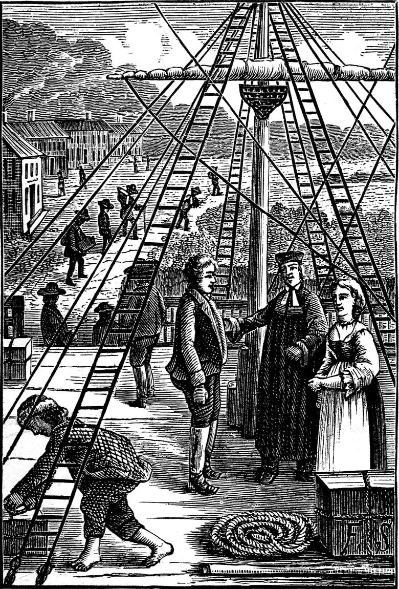 „Der Menschenhandel auf dem Schiffsmarkt geschieht also: Alle Tage kommen Engländer, Holländer und hochdeutsche Leute aus der Stadt Philadelphia und sonst aller Orten, zum Theil sehr weit her, und gehen auf das angekommene Schiff, welches Menschen von Europa gebracht, feil hat und suchen sich unter den gesunden Personen, die zu ihrem Geschäfte passen, heraus und handeln mit denselben, wie lange sie für ihre, auf sie haftende Seefracht, welche sie gemeiniglich noch ganz schuldig sind, dienen wollen. Wenn man dann des Handels eins geworden, so geschieht es, daß erwachsene Personen für diese Summe, nach Beschaffenheit ihrer Stärke und Alter, drei, fünf bis sechs Jahre zu dienen sich verbinden. Die ganz jungen Leute aber von 10 bis 15 Jahren müssen dienen bis sie 21 Jahre alt sind. Viele Eltern müssen ihre Kinder selbst verhandeln und verkaufen wie das Vieh, damit sie, wenn die Kinder ihre Frachten auf sich nehmen, vom Schiffe frei und los werden können. Da nun die Eltern oft nicht wissen, wohin ihre Kinder kommen, so geschieht es oft, daß nach dem Abscheiden vom Schiffe manche Eltern und Kinder viele Jahre oder gar Lebenslang einander nicht wieder sehen. Ein Mann muß für sein Weib, wenn sie krank hinein kommt und so ein Weib für ihren Mann stehen und die Fracht auf sich nehmen, und also nicht allein für sich, sondern auch für den Kranken fünf bis sechs Jahre dienen.“[1]