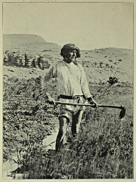 Lelo dropped the point of his heavy irrigating hoe and stood with chin dented upon the rude handle, looking intently to the east. Around his bare ankles the rill from the acéquia[1] eddied a moment and then sucked through the gap in the little ridge of earth which bounded the irrigating bed. The early sun was yellow as gold upon the crags of the mesa[2]—that league-long front of ragged cliffs whose sandstones, black-capped by the lava of the immemorial Year of Fire, here wall the valley of the Rio Grande on the west. Where a spur of the frowning Kú-mai runs out is a little bay in the cliffs; and here the outermost fields of Isleta were turning green with spring. The young wheat swayed and whispered to the water, whose scouts stole about amid the stalks, and came back and called their fellows forward, and spread hither and yon,[2] till every green blade was drinking and the tide began to creep up the low boundaries at either side. Up at the sluice gate a small but eager stream was tumbling from the big, placid ditch, and on it came till it struck the tiny dam which closed the furrow just beyond Lelo, and, turning, stole past him again to join the rest amid the wheat. The irrigating bed, twenty feet square, filled and filled, and suddenly the gathered puddle broke down a barrier and came romping into the next bed without so much as saying “By your leave.” And here it was not so friendly; for, forgetting that it had come only to bring a drink, it went stampeding about, knocking down the tender blades and half covering them with mud. At sound of this, Lelo seemed suddenly to waken, and lifting with his hoe the few clods which dammed the furrow, he dropped them into the first gap, and jumping into the second bed repaired its barrier also with a few strokes. Then he let in a gentler stream from the furrow.