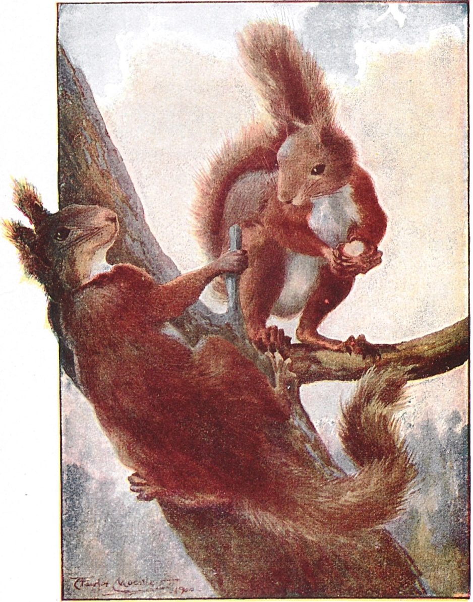 Im Mai sind sie sehr geschäftig. Sie sammeln Blätter, Moos und kleine Zweige. Aus diesen bauen sie ein Nest in einer Baumgabel, hoch über dem Boden. Im Juni werden dann ihre Jungen geboren. Paul kletterte hinauf und sah vier solche hübsche kleine Eichhörnchen, die mit rotem und weißem Pelze bedeckt waren. Sie blieben eine Zeitlang im Neste, doch sahen wir auch oft, wie sie sich zwischen den Zweigen bewegten. Die alten Eichhörnchen bewachten sie sorgfältig, und sie blieben den ganzen Sommer lang zusammen.