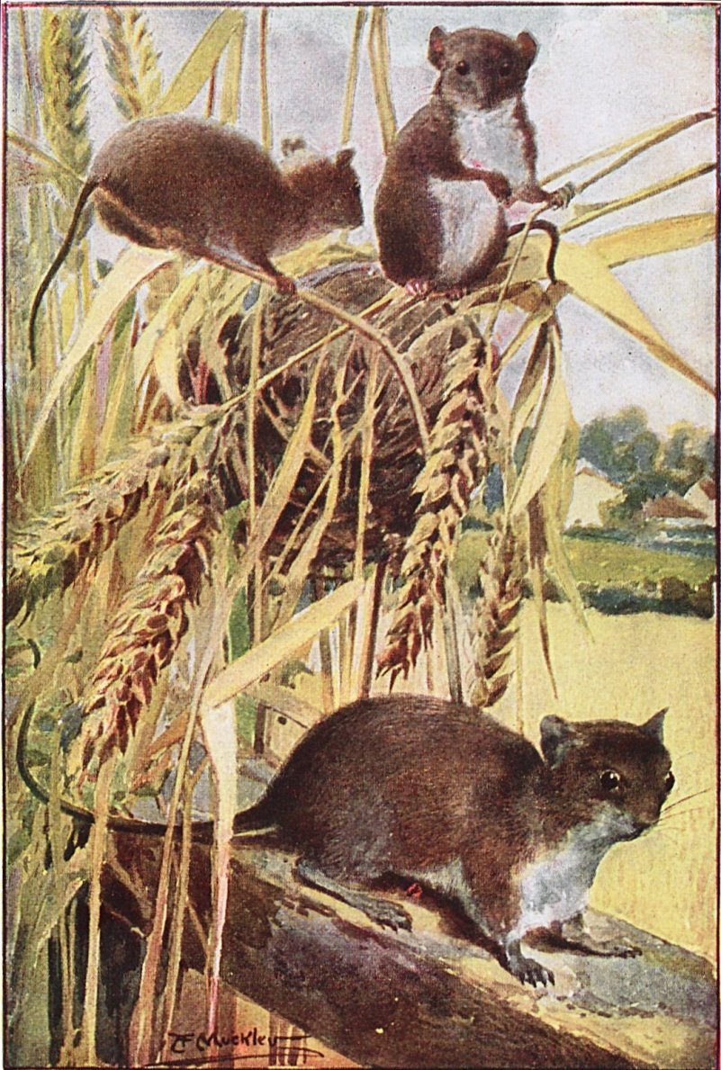 Vorigen Sommer fanden wir eins von diesen Nestern. Es war ungefähr so groß wie ein großes Schwanenei und von derselben Gestalt. Wir guckten hinein und fanden sieben winzige kleine Zwergmäuse mit rotbraunem Fell auf dem Rücken und weißem Fell am Bauche.