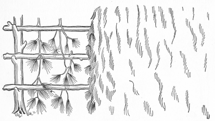 The first thing to be considered on going into the forest is the camp where the night is to be spent. In choosing a place for this see that there is fresh water, wood for the fire and brush-wood for building a "lean-to," or hut, at hand. It is well to build on a dry, level place, with just enough slope to the ground to insure the water running away in case of rain. The Indians used to live in huts thatched with brush-wood, and these are best made by building what is known as a "lean-to." Look for two trees standing from eight to ten feet apart on your camping place, with branches from six to eight feet above the ground. By placing a pole from one tree to the other in the crotches and leaning other poles against this one, brush-wood can be woven in to form a very good roof. Branches of the balsam or hemlock are best for this purpose, and the needles should point down. It is well to collect as many soft, thick tips of trees of this character as possible, both for the thatching and to make the beds.[11] Cover the floor of the "lean-to" with these tips thickly and lay the rubber blankets on top, rubber side down. Be sure to make the head of your bed toward the inside and away from the opening. You will find that this makes a very comfortable bed.