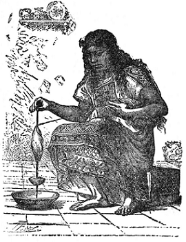 In olden times, before the Indians had matches, and even before they had the flint and steel that our grandfathers used for making fire, they used rubbing-sticks. Many people have tried to make fire in this manner, but few have succeeded.[12] As a matter of fact, it is not a very difficult thing to do if you know how, as the Indians did. In fact, they grew so expert that they could make fire almost as quickly as we can strike a match. The easiest and surest method of doing this is to use the bow-drill. The tools necessary consist of a bow, or bent stick, about two feet long, with a stout leather cord attached to each end. The drill consists of a straight piece of wood pointed at each end. One end of this rests in a drill-socket, which is simply a piece of wood with a small notch in it for the top of the fire-drill. This piece of wood is held in the hand, while the other end of the fire-drill is placed in the fire-board. This consists of a thin piece of wood with small pits cut about half an inch from the edge, and with a notch extending from the edge into the middle of the pit. The leather thong is given a single turn about the fire-drill and then by drawing the bow backward and forward the drill is caused to rotate very rapidly in the fire-board. After a short while the dust which comes out of the notch grows hot and becomes a glowing coal, which can be easily ignited into a blazing fire.