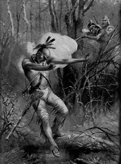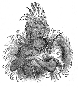 The famous mongrel was the head and front of the rebellion. A force of seven hundred men, while crossing the Ouithlacoochee River, were attacked by him, and in an hour's fight, the Americans suffered a loss of sixty-three killed and wounded, though they inflicted a greater loss upon their assailants. During this struggle, Osceola was recognized many times by the soldiers. He wore a red belt and several long, stained eagle feathers in his hair. He would stand behind a tree, while reloading his rifle, after which he would step out into full view and fire with a deliberate aim. He was seen to level his gun at General Clinch several times, but fortunately that officer, who rashly exposed himself, was unharmed, though his clothing was pierced by one of the bullets of the Seminole chieftain.