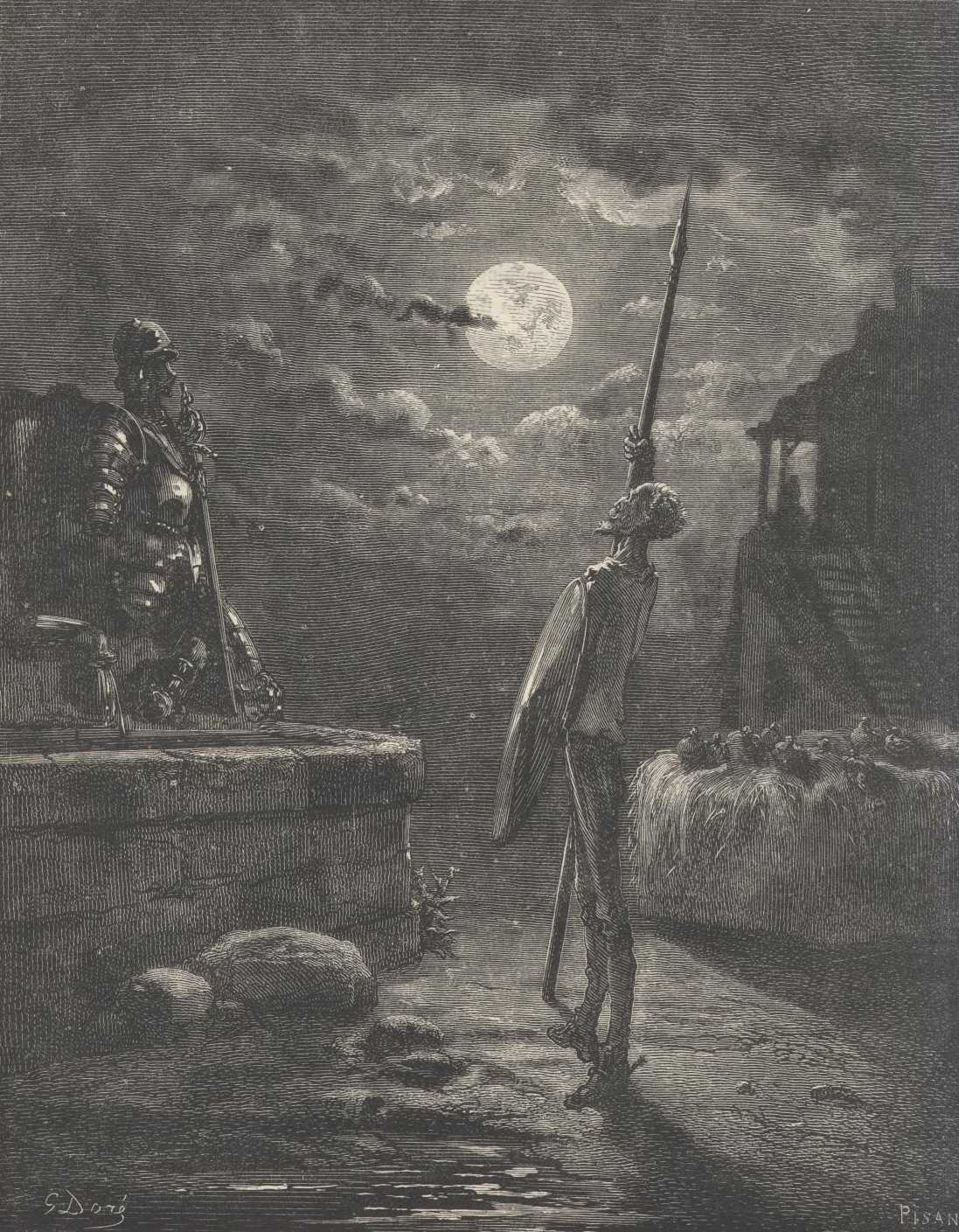 The landlord told all the people who were in the inn about the craze of his guest, the watching of the armour, and the dubbing ceremony he contemplated. Full of wonder at so strange a form of madness, they flocked to see it from a distance, and observed with what composure he sometimes paced up and down, or sometimes, leaning on his lance, gazed on his armour without taking his eyes off it for ever so long; and as the night closed in with a light from the moon so brilliant that it might vie with his that lent it, everything the novice knight did was plainly seen by all.