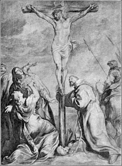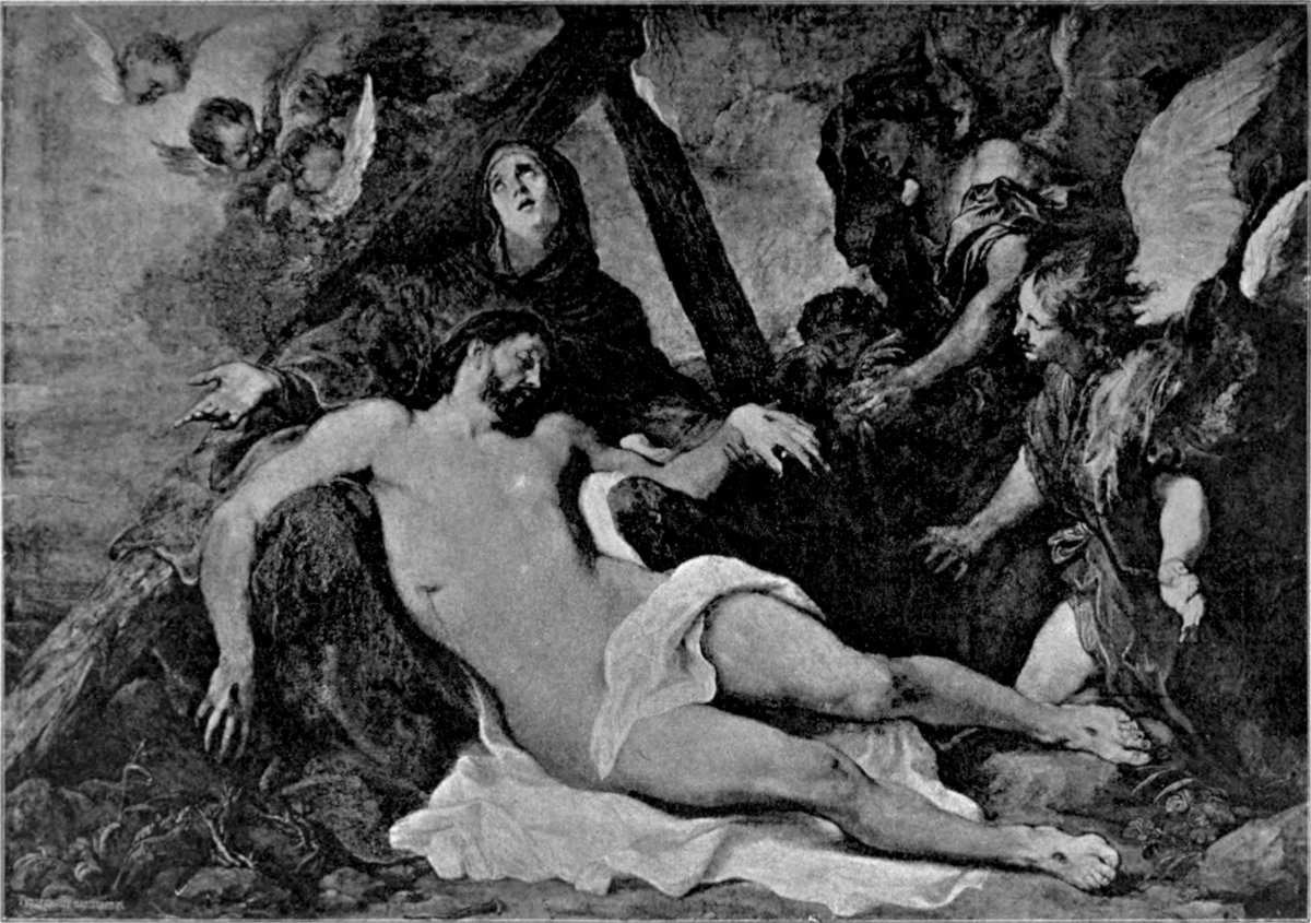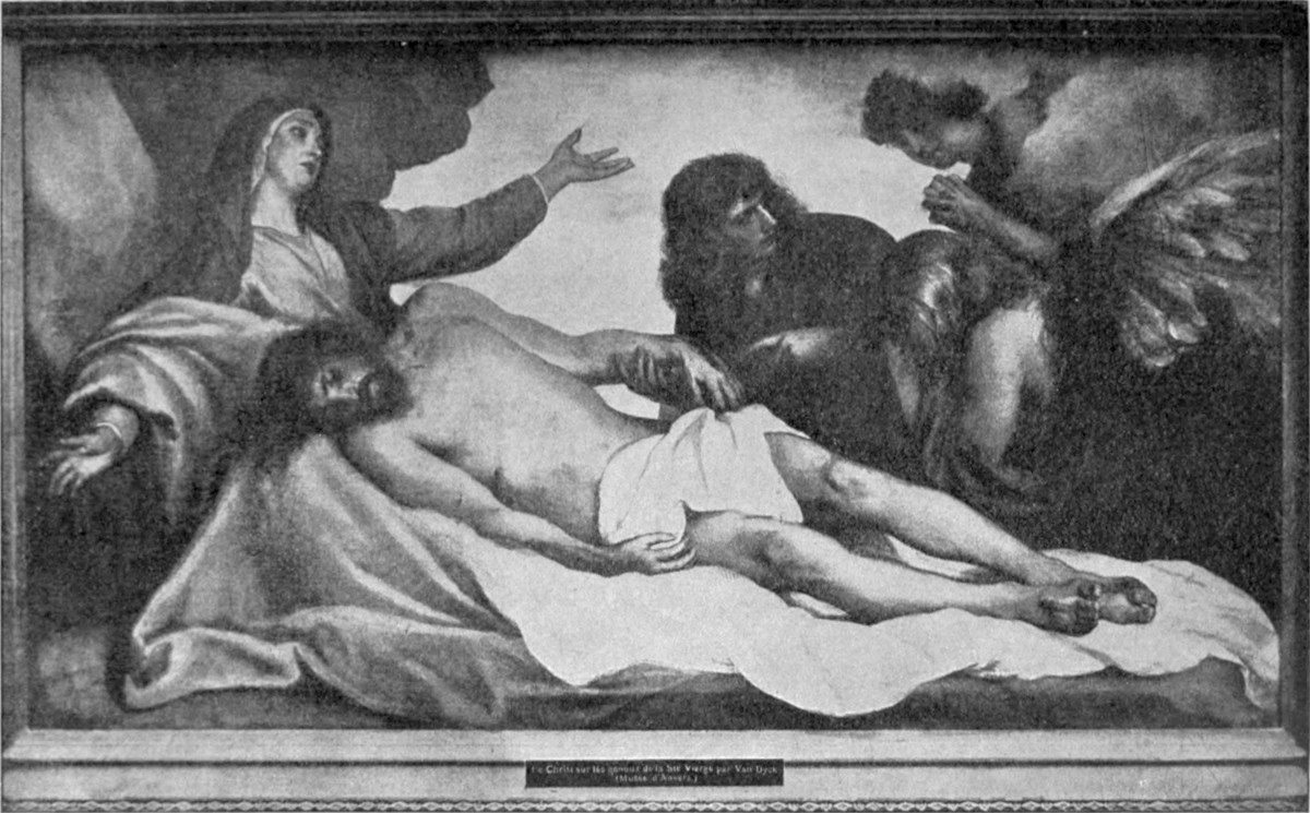 Eine Vorliebe für einen kühlen Ton, für den die schwarze Farbe die Grundstimmung angibt, gilt im Gegensatz zu der aus einem warmen Dunkelbraun heraus entwickelten Stimmung seiner früheren Werke als bezeichnend für van Dycks spätere Zeit. Hiernach gelten auch noch einige religiöse Bilder als Arbeiten, deren Entstehung in die Zeit dieses vorübergehenden Aufenthaltes in den Niederlanden fallen könnte. Zwei Gemälde der Münchener Pinakothek gehören in diese Zahl: ein Christus am Kreuz und eine Beweinung des heiligen Leichnams, also Behandlungen jener beiden Darstellungsstoffe, die ihm auch in früherer Zeit so häufig als Gegenstand gedient hatten. Das Kreuzigungsbild, in nur ein drittel Lebensgröße ausgeführt, zeigt den Heiland nach seinem Verscheiden. Vor einem düster schwarzgrauen Himmel ragt das Kreuz empor. Undeutlich sieht man in der Finsternis die Masse des[S. 74] abziehenden Volkes. Der Tote am Kreuze, dessen Haupt vornüber gesunken ist und den ein helles, auf dem Oberkörper am stärksten gesammeltes Licht hervorhebt, bleibt einsam zurück. Der Wind spielt mit dem Aufschriftzettel am Kreuz und mit dem Zipfel des Lendentuches (Abb. 49). Bei der Klage um den Leichnam Christi ist die Farbe vielleicht noch mehr auf den Ausdruck von Schmerz und Trauer gestimmt, als bei irgend einer der früheren Darstellungen dieses Gegenstandes. Die dunkle Felsenwand bildet den alleinigen Hintergrund für die drei Gestalten, die sich mit dem Toten beschäftigen. Die Unbehilflichkeit der Last eines noch nicht erstarrten Toten ist stark betont. Das Haupt Christi ist in äußerster Biegung des Nackens mit dem Gesicht auf den Schoß der Mutter gesunken. Diese blickt mit einer Frage des Schmerzes zum Himmel empor; Magdalena ringt die Hände und blickt auf den Toten herab; Johannes bricht in lautes Weinen aus (Abb. 48).
