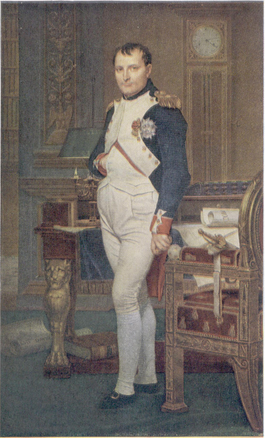 Remarkably free from the allegorical pomposity of most official portraits, this picture presents Napoleon I with reserved dignity. The emperor himself approved it and, upon its completion in 1812, complimented David. Dressed in his favorite costume, the uniform of the chasseur de la garde with a general’s epaulettes, Napoleon wears the Legion of Honor and the Order of the Iron Cross, which commemorates his earlier coronation as king of Italy. He seems to have just risen from his desk, on which lies the Code Napoléon, the codification of French law which he promulgated.