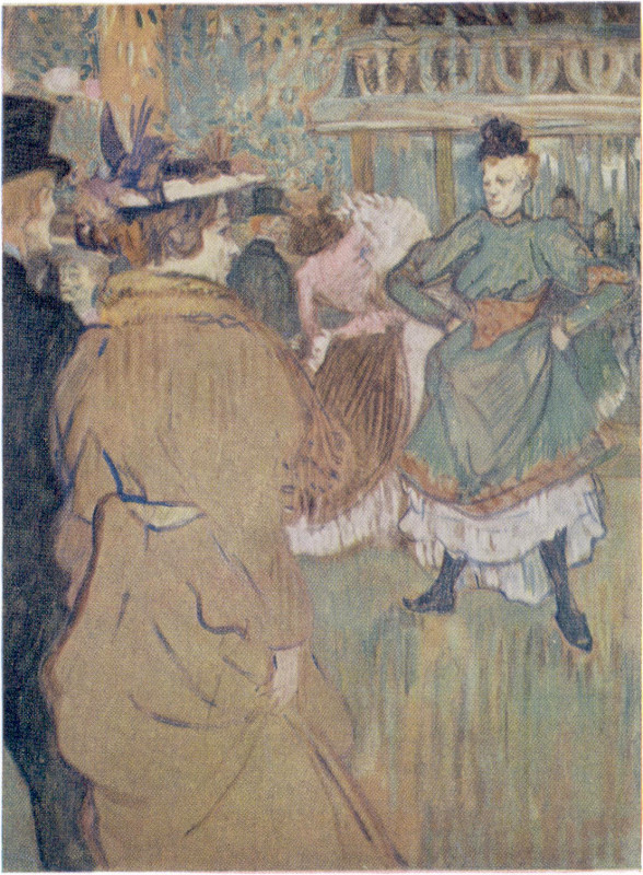 In tones of green and copper Toulouse-Lautrec has captured the tawdry gaiety of Montmartre’s most colorful night spot in the gay ’nineties. The Moulin Rouge, despite its name, was never a windmill; it is a dance hall which uses the sails of a mill for advertising. Lautrec frequented it because he enjoyed watching the nightly performances of its spirited dancers. Their specialty, the quadrille, grew out of the high-kicking cancan; almost as vigorous, it was even more complicated. Dominating the scene here, Gabrielle, a popular professional dancer, has hoisted her skirts as she lines up with the others to begin the dance. With telling outline, Lautrec characterizes her robust physique and hoydenish air. She is in sharp contrast to the woman facing her, in the foreground, whom Lautrec has shown as delicately refined.