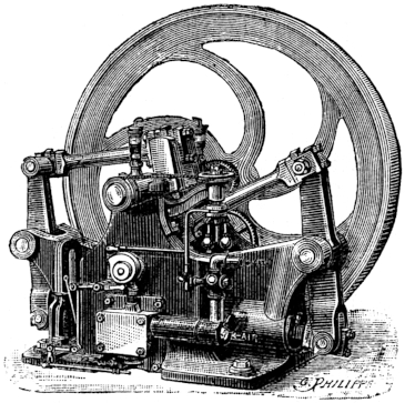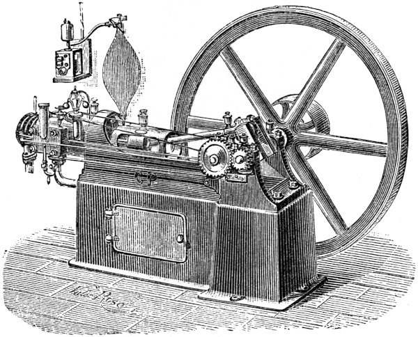 This machine, devised by Lenoir and constructed by Marinoni, had the appearance of a double-acting horizontal steam engine. The explosive mixture was ignited by an electric spark produced by a Ruhmkorff coil and a primary battery. The machine ran smoothly and regularly and its cost was moderate: among the advantages which it possessed at that time over other forms of motive power, were the absence of a cumbrous boiler and costly foundations, and the little care and attention necessary to keep it in working order. So great was its success at the time, that many people prophesied that the steam engine would soon become extinct.