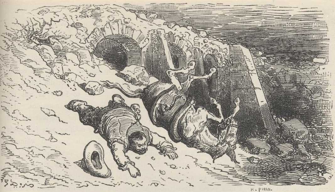In this strain did Sancho bewail himself, and his ass listened to him, but answered him never a word, such was the distress and anguish the poor beast found himself in. At length, after a night spent in bitter moanings and lamentations, day came, and by its light Sancho perceived that it was wholly impossible to escape out of that pit without help, and he fell to bemoaning his fate and uttering loud shouts to find out if there was anyone within hearing; but all his shouting was only crying in the wilderness, for there was not a soul anywhere in the neighbourhood to hear him, and then at last he gave himself up for dead. Dapple was lying on his back, and Sancho helped him to his feet, which he was scarcely able to keep; and then taking a piece of bread out of his alforjas which had shared their fortunes in the fall, he gave it to the ass, to whom it was not unwelcome, saying to him as if he understood him, "With bread all sorrows are less."