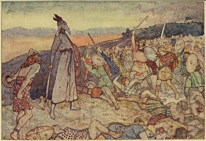 “Back, prince, or thou shalt die,” said Feargus once more, wishing to spare the spilling of blood. Drunk and mad with anger, however, the prince heeded not, but laid his steel against that of Feargus, though it was only a moment ere the sword of Feargus was buried in his body, and the blood of him leaped up suddenly from his mouth and, to the horror of his men, he fell back dead. Then Feargus tried to stop the Northumbrians, stout fighting men and big of body, but they would not hearken to him, coming on crying, “Down with him! he hath killed the[216] prince!” They pressed against him on the right hand and the left, but so close the one upon the other that they had little space to move, while lightly Feargus swung his brand from behind the benches, so that they could not get into him, and legs and arms were shorn in its sweep, until there lay before him a confused and bloody mound, mixed up with wine cups and meat and drink and table gear, and still the Picts and Britons withheld from the strife. But Feargus knew that the fight must go against him, so thick and fast they came, wounding and trampling on each other in their eagerness to get at him. Then, wounded and weary of so much sword play, in a pause of the fight he cried out in Gaelic, “Now here am I, Feargus, son to king Nechtan of the Hundred Fights, and kin to all ye Picts and Britons, and my lady is of the South Albanich by her mother’s side. Yet though of these Northumbrians I have slain some and maimed more, till I am sick of slaughter, yet my lady and I must fall, so many are our enemies. Never a friend shall he lack though all the world be turned against him who helpeth me.”