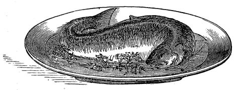 In “Gastronomie,” M. M. believes in a compromise on the carving question. He says, “There were professional carvers, and this important art was anciently performed at the sound of music, and with appropriate gesticulations. We wish our modern gourmands would follow the very good example of Trimal{19}chio in this respect, and, if they must have their viands carved on the sideboard by servants, take care that, like his carvers, they are trained to his art. We shall take the opportunity of entering our protest against an innovation which is going too far. That some of the more bulky pieces, the pièces de résistance, should be placed on the sideboard, well and good, though even to this Addison objected, and not without reason; but that the fish and the game should be both bestowed and distributed, like rations to paupers, by attendants, who, for the most part, can not distinguish between the head and the tail of a mullet, the flesh and fin of a turbot, etc., is enough to disturb the digestion of the most tolerant gastronome. We must say that we like to see our dinner, especially the fish, and to see every part of it, in good hands.”
