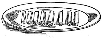 At opposite sides of the table place salt and pepper stands, together with the different fancy spoons, crossed by their side, which may be necessary at private dinners, for serving dishes.