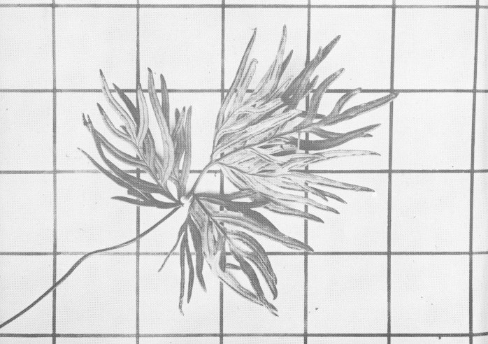 The Psilotum is a primitive plant, of which two species are found in the Hawaiian Islands. One is the MOA, which usually grows on the ground and has stems which fork many times near the ends. The second, the PIPI, often grows upon the trunks of trees and ferns. This species normally grows perpendicular to the trunk, then curves abruptly earthward like the tail of a horse. Degener (2, p. 18) states that the MOA was used by the Hawaiians in making a medicine for treatment of a fungus disease, as an emetic, and that the spores were used as a powder to relieve chafing from the malo, or loincloth.