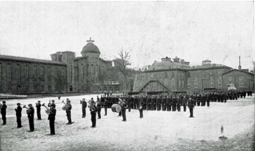 That command dispersed the young soldiers and sent them off to fun of their own making, just as the order to assemble for drill had found them, scattered here and there. It had not been a regular “school day” and none of them had been in the vast schoolroom in the main building, busy with books. At the moment when the military instructor’s whistle had sounded, a brisk game of base ball had been going on in the ball ground, next to the parade-ground. On that itself, a number of knots of boys had been skylarking. Most of them had been indoors, however, and of these, some had been in the conservatory, learning to be gardeners; others in the printing shop; in the tailor-shop; in the shoe-shop; in the stocking factory; in the carpenter shop; in the rope and matting shop; and so on. It was not the season for farm work[17] and none had been away outside, on the island farm learning to be farmers as they soon were to be, later in the spring. Moreover, the model ship, in front of the main building, toward the East River, had a deserted look, but it was waiting for the boys to come, crew after crew, and play sailors under the nautical instructor. In that way many of them were to get themselves ready to go to sea, really some day.