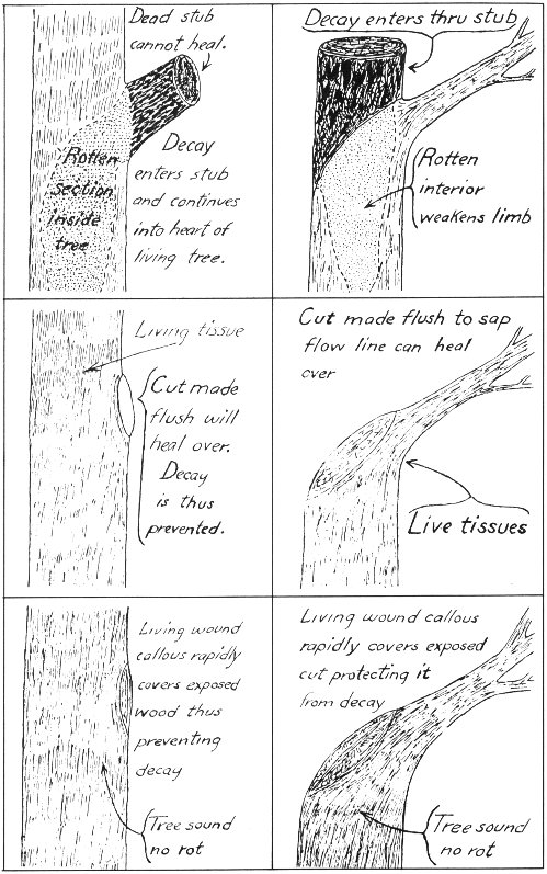 Granted that in some cases pruning will have to be severe, but if it is done properly the tree will have a chance to live. When a large branch is cut off and a stub is left, the growth processes stop in the projected stub, but continue their natural course of flow at its base in the parent branch. Each year as the tree grows it builds up a new growth ring around the stub. This is noted as a swelling, and will continue to grow in size each succeeding year. In the meantime, the dead stub is exposed to the elements and begins to rot away. In time it will decay back to the stem or trunk and be sloughed off and the original wound may close over with new growth rings. Usually before this happens, the organisms causing decay of the stub enter the main stem and begin their slow but deadly work there, so that in time the entire tree may become decadent.