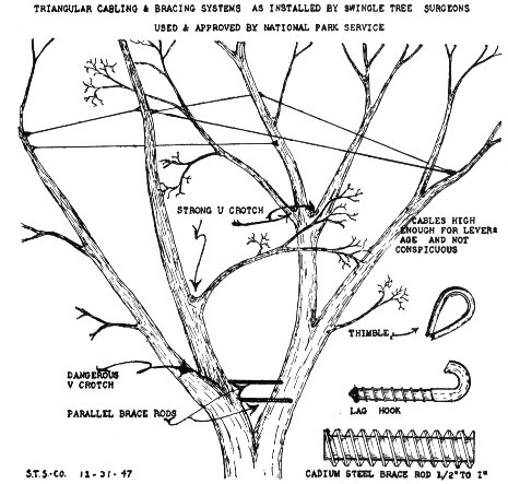 Another repair that may be necessary is the cabling and bolting of split or weakened crotches. This is based on engineering principles and should be attempted only by an experienced arborist. The sketch on page 331 shows one application of this method.