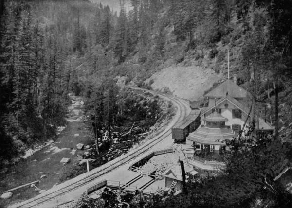 20But we have now reached the backbone of the divide and our train starts down the western grade, circling like a hawk out of the sky. Over immense fills, through deep cuts, across bridges, following a swiftly-flowing stream, until at length we gain the level valley and go dashing away to Graymont, on the way to Idaho Springs and Georgetown. To avoid tunneling in crossing the divide, the railroad winds around the mountain elevations, up a steep grade, over a way that has been blasted out of the eternal rocks, until from away up the lofty sides the traveler may look upon a scene of marvelous beauty and ruggedness that fades into indistinctness miles below. Leaning out of the car window we view a wondrous panorama, and pause directly to bring our cameras into use, that the scene may be caught and held on paper. There on one side of the depths is Devil’s Gate, in close proximity, as it seems, to Bridal Veil Falls, where the clear mountain stream plunges over a precipice of great height to join the gamboling creek that rushes away on its errand hundreds of feet below. There, too, is a spider’s web of steel, eighty-six feet high, that has served as a passage-way for our train across a chasm 300 feet wide, whose bottom can scarcely be distinguished from our lofty eminence; but we see that the track makes a complete loop, and that the road parallels itself, at a constantly increasing grade, no less than three times. All the while that we are winding around and crossing our own track, Georgetown continues visible, but it is dwarfed by the distance to the appearance of a prairie-dog village.