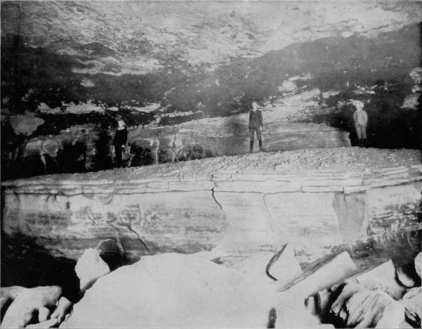GIANT’S COFFIN, MAMMOTH CAVE, KENTUCKY.—This remarkable and weird curiosity is composed of a huge block of stone forty feet long by twenty wide, and when viewed from a certain angle the resemblance to a funeral casket is so great that, even if attention were not called to it, visitors would hardly fail to be a little shocked by the uncanny sight. Standing within its presence it is almost impossible to divest one’s self of the belief that he is gazing upon the last resting-place of some tremendous giant, the guardian genius, perhaps, of this lugubrious subterranean abode; and it is with a sigh of relief that we pass on to more inspiring and splendid scenery.