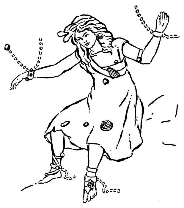 “As he whirled and twisted, his long trailing robes wound close about his feet, then curved out again, smooth and black in the water, like the curves of a lily-petal. They looked quite black to Taffy; but as the light struck through the edges and thin folds, he saw that they were green—like the green water under him. And following after, leaping, snarling, jumping at the edges of his robes, the white foaming waves joined in the chase, and came rushing, whirling down on the two motionless ships.
