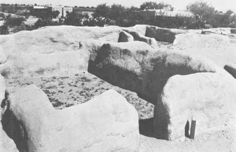 This room is one of approximately 60 rooms inside the compound wall. Walls and floors were made of caliche, and ceilings were layers of poles, saguaro ribs, and reeds capped with a covering of caliche. Some rooms, like this one, had doorways; other rooms had hatchways in the roof centers. A small clay fire pit, about 1 foot in diameter, was in the center of each room. During hot weather, cooking was done out of doors. (See next page).