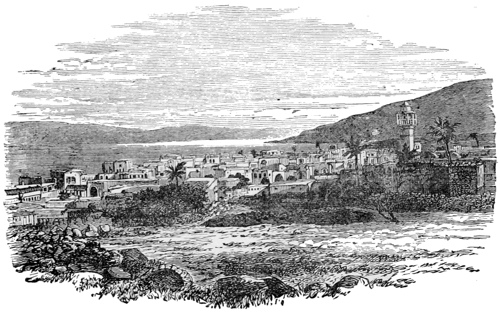 After a pleasant ride, skirting the plain of El Buttauf, we halt for tiffin in the pleasant orange grove of Lubieh, where in 1799 the French, under Junot, held their own against a vastly superior army of Turks, and succeeded in reaching Tabor just in time to fall on the rear of the force then pressing hard upon the main body under Napoleon. Soon after, we catch a glimpse of the little lake of Galilee or Tiberias, at one time, in the bright sunshine, looking like an emerald in a golden 9setting, and at another time, when a passing cloud veils the God of day, like a jasper diamond set in an agate frame. We put up at the Latin Monastery in Tiberias or Tabarea, where we are entertained by the Father Superior hospitably as we were on a former occasion. Before leaving Tiberias, we trot along the shore to visit the hot Sulphur Springs and old Roman Baths, which are still greatly used.
