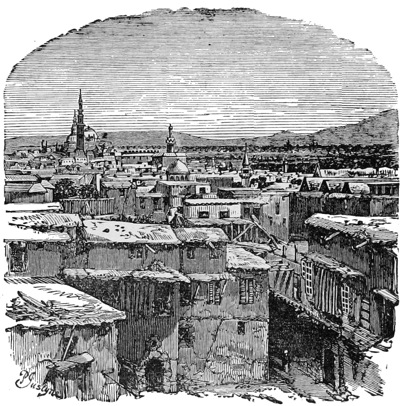 To brace ourselves up for our rambles, we now take a bath in the waters of the Abana, which are, as its Syrian name Barada indicates, remarkably cool and pleasant. Having tried Jordan too, we must endorse Naaman’s opinion, that the bathing in the former is decidedly the best. In the midst of the city, we are shown a sycamore tree, 42 feet in girth; certainly a curiosity in any city, but especially so in a Mahommedan one, where the process of destruction is carried on by man and that of re-construction or re-placement left to “Allah.” We also see another tree in the horse market close by, used as a gallows, but public executions are very rare in Turkey. A good Moslem is peculiarly sensitive—he does not object to strangle a wife or two quietly at home if they are annoying, but he objects to a fellow male Moslem being publicly executed even for a murder. We look into the great mosque; in its courtyard are the remains of a small ancient temple to the sun—it was once a Roman temple, then a Greek basilica, and was in more ancient times probably the site of the very temple in which Naaman bowed the knee to Rimmon, when his master worshipped there. We found it easier to enter St. Sophia at Stamboul, the mosque of Omar at Jerusalem, and the grand mosque at Cairo, than this, the people being so fanatical. St. Sophia, in fact, we got into by only paying a few francs to the door-keeper, but here it costs a lot to get in. We are next shown the tomb of the great Saladin, who died 1193, but as it is very sacred, cannot view the interior. We now come to the street called “Straight,” above a mile long, running through the city east to west, and on our way we call at the traditional 33house of Ananias, now a small Latin Church; then just outside the east gate we pass the reputed house of Naaman, now appropriately a leper hospital, and come upon that part of the wall from which it is said St. Paul was let down in a basket at the time when Aretas, the Petræan ruler of Arabia, was King. Aretas was the name of the dynasty, like, Ptolemy and Pharaoh of Egypt, Candace of Ethiopia, &c. The conversion of St. Paul is said to have taken place just outside the city—the spot is shown: bright indeed must have been the light before which an eastern sun at mid-day paled. A walled up gate is also shewn as that by which St. Paul entered the city.