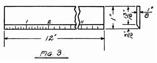 The scale for measuring (Fig. 3) should be made first, as it is the tool most necessary in laying out the other tools. One of the thin strips from the side of the egg crate may be used for[2] this. The outline of the scale must be drawn on the wood with a hard pencil. A “6 H” is the best. The “H” means “hard,” and the number of H’s shows the degree of hardness. The pencil should be sharpened on both ends—one end rubbed to a fine point on sandpaper, and the other end to a chisel point. The sharp point is to mark, accurately, the points to which lines are to be drawn, and the chisel point is to draw the lines with. After the outline is drawn it may be cut.