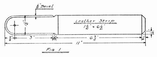 The knife strop shown in Fig. 1 is a great help in whittling, because it will keep your knife in good condition. A piece of the heavier wood at the end of the egg crate may be used for this. It is made from a strip measuring 11⁄2″ wide by 11″ long, and the strip of leather (cut from a discarded razor strop) is glued on. The 1⁄8″ bevel is continued all the way around the handle on both sides to make it fit the hand. The hole in the end is to hang it up by, and may be made with a hammer and nail, or with a bit and brace if you have one.