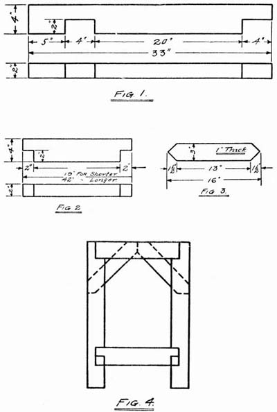 First, saw off from your one-by-two-inch strip four pieces twelve inches long and four pieces eleven inches. These are to make Figs. 1, 2, and 4. Make four pieces like Fig. 1 and two pieces[172] like Fig. 2; the notch at the end is cut with a saw across the grain, and then split out with a chisel.