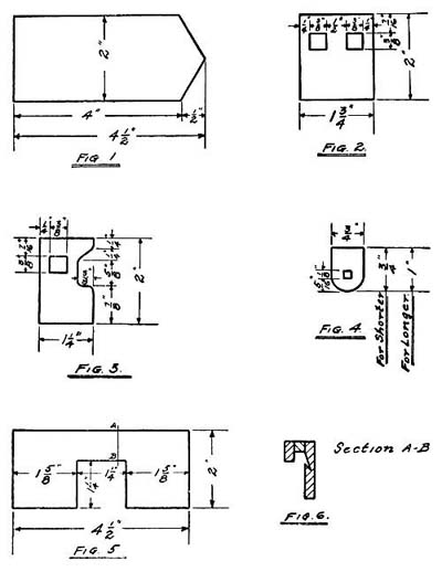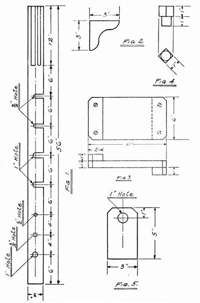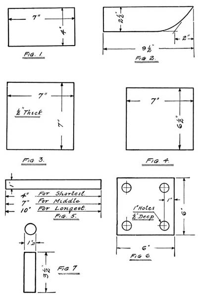 [169]Fig. 3 is eight and nine-sixteenths inches long and one and seven-sixteenths wide and one end is rounded into a half circle. Figs. 3 and 4 are nailed in position on the inside of the side pieces, and together they form the track around which the cover runs. Two of each are required. Fig. 5 is the bottom piece, and is simply an oblong nine inches long by two and a half wide. It is placed in position with the side pieces upright on either side of it and nailed from the outside.