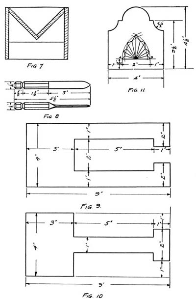 The next piece to make is Fig. 10—an oblong measuring one and a half inches by two and a half, and cut to make a joint with Fig. 2. This is placed across the top and nailed down, covering the rounding end of the “track.”
