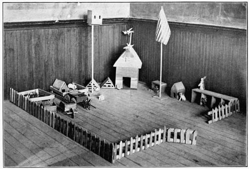 A long, shallow tin with very narrow sides is the foundation for the Indian village. The tinsmith has large sheets of bright new tin, and he will make you one of these shallow tin trays for just a few cents. The florist will give you a basket of soft, black earth—enough to fill the tray—and you can mold and pat it into tiny hills and queer little valleys, and long foot paths, no wider than your little finger for the toy Indians to trail up and down.