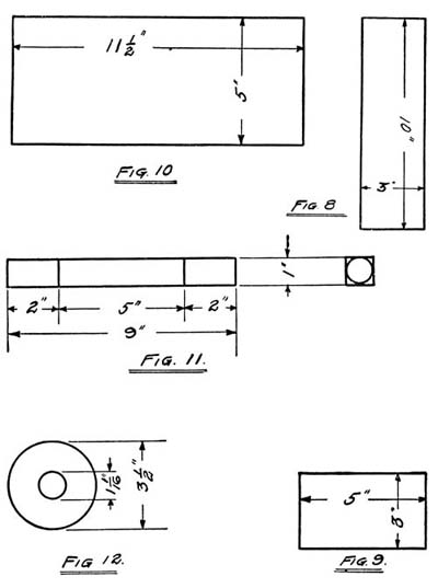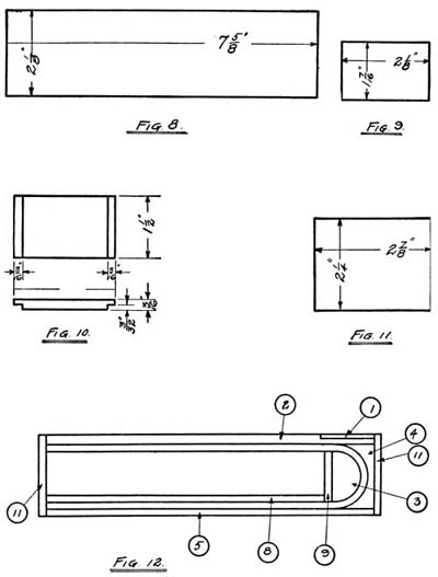 Fig. 8 and Fig. 9 are a false bottom and false end, which form the receptacle for the pencils, and hide the mechanism of the cover. They are nailed in position as shown in Fig. 12. The nails to fasten these in place must be a little longer than the others, because they have to be nailed from the outside and must go through two thicknesses of wood and project into a third.