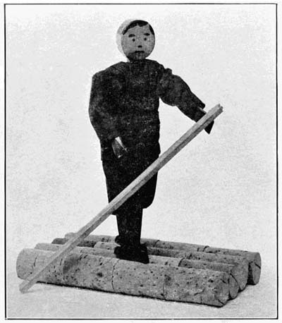 You can make a whole tribe of these corn-cob Indians, and it will be the most fun of all, even jollier than making a corn-cob fence, and a raft, and a house. First, wind corn husks around a cob to make the Indian’s clothes, but leave one end, the larger end of the cob, uncovered because that is going to be the Indian’s head. Then on[158] this end, mark a face with a bit of charcoal; eyes, nose, and mouth; and paint the cheeks red with a crushed cranberry, rubbing the juice on the corn cob. The hens’ nests in the barn are full of ever so many pretty feathers, so you can collect as many of these as you wish and glue them to the corn-cob Indian’s head for his headdress. Last of all, ask mother if she is willing to give you a few pieces of the left over plain cloth from sister’s school dress for the corn-cob Indian’s blanket. Of course mother is willing. Almost every mother is willing to give a boy things when he is trying to amuse himself all alone. She may even cut a square of gay plaid from the piece of cloth itself and turn out all the pieces from her sewing bag, where there are other scraps just right for Indians’ blankets; red flannel, and gray serge like your last winter suit, and brown merino, and yellow silk.