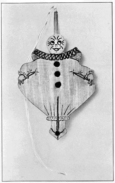 Now you can make the Indians. English walnuts form the heads. These are just the right size, brown enough for the complexion of any Indian, and nicely wrinkled, too. With a sharp[153] jack-knife smooth down a few of the walnut’s wrinkles, and carve the Indian’s features, trying to give him high cheek bones. Color his cheeks with vermilion and paint his face, too, in as many different colors as you like. A roll of stiff paper or cloth glued to the nut head makes the Indian’s body, about which is wrapped a blanket of fringed crépe paper, red flannel, or any sort of gay stuff that mother will give you. This walnut Indian wears a marvelous feather headdress. The feathers come from the chicken yard or the oldest feather duster—whichever source is available—and they are glued to a strip of brown paper which, in turn is glued to the little Indian’s head.