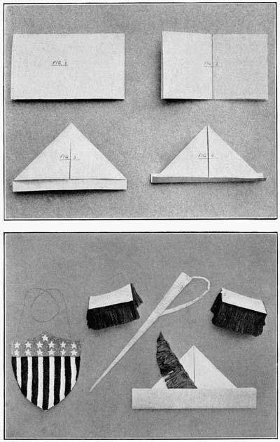 [152]Under the trees the Indian wigwams are scattered. Making these tepees is ever so much fun and will fill a long winter evening after your lessons are learned and you have the library table free to work on. Fig. 1 shows you how to cut out an Indian wigwam, and heavy dark brown paper or brown canvas is a strong material to use. When the wigwam is cut, it may be decorated with paints in any design you wish. A border of small squares is an attractive decoration, or some grotesque heads and bows and arrows may be painted on. Gold or red paper stars and crescents and suns may be cut and glued to the outside of the wigwam, forming a very gay scheme of trimming it, or very tiny autumn leaves may be waxed and glued on. When a number of these little wigwams have been cut, decorated, and glued together, as shown in Fig. 2, place them in your play forest, using two or three twigs crossed for supports, the ends extending through the hole in the top of the wigwam.