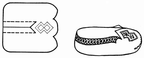 Another marble bag that will prove very satisfactory, and will be so unusual that the boy who[162] owns it can gloat over the other fellows, is made of very heavy chamois, or buckskin. A paper pattern is made first, like Fig. 1. It measures two and a half inches across the top, four and a half inches from side to side at a point three and three-quarters inches below the top, and its height is six and a half inches. After these points have been determined a boy can mark in the vase shaped outline freehand. When the pattern is made and cut out, lay it on the buckskin, holding it carefully, so that it will not slip, and cut four pieces just alike. Then take a large darning needle or a “rug” needle and thread it with a strand of raffia. If red, or blue, or green raffia are used instead of the ordinary natural color, it will make the sewing very decorative. Take two of the pieces of buckskin, and, beginning at the bottom, sew them together with the stitch that is used for making baseballs. This is done by taking a stitch up from underneath, then crossing over, and taking a stitch up from the under side of the other piece, then back to the first piece and so on, drawing the raffia snug each time. Instead of making a knot at the beginning, leave the raffia hanging loose for about an inch or more, and when the top of the seam[163] is reached, fasten the raffia tight before cutting off. Next join the third piece to the second in the same way, the fourth to the third, and then the fourth to the first, so that all four together form a bag. Take the four ends of raffia at the bottom and knot them snugly together, two by two. They may be trimmed off short, or left hanging loose to form a tassel for decoration. Now take a narrow piece of soft wood and slip it inside the mouth of the bag, so that you can cut slits for the draw string. They are cut with a sharp penknife and should come just at the narrowest part, or neck of the bag. If the upper ends of the cuts are three-quarters of an inch from the top of the bag, and the cuts themselves a half inch long, they will be about right. There are four cuts in each section making sixteen cuts in all. Next take three pieces of raffia twenty-four inches long. Knot the three together at one end, and then braid them tightly into a cord. When the other end is reached knot it as you did the first. String this cord through the slits in the neck of the bag just as though you were weaving—under one, over one, under one, over one—and then when it is all strung, tie the two ends together in a square knot.